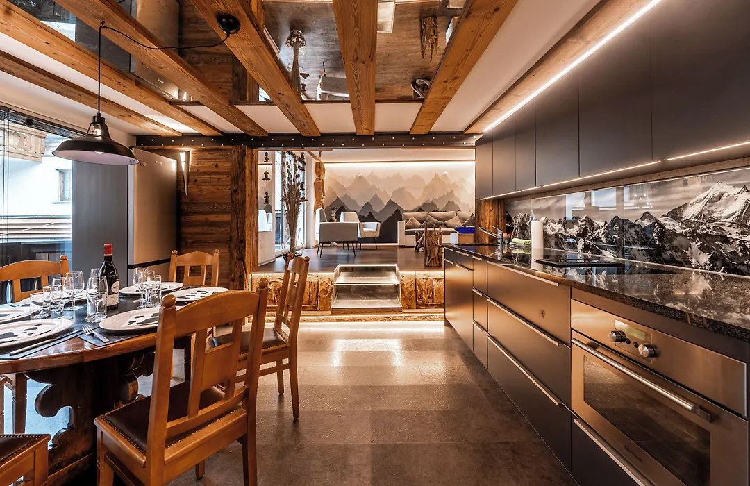 Una cocina en el Village Center Apartment Kanne By Inspiringplaces Zermatt cuenta con nevera grande, un horno y placa de cocina. El aeropuerto más cercano es Sion, a 85 km de este apartamento. El acceso a un salón de spa garantiza una estancia más agradable para todos los huéspedes.